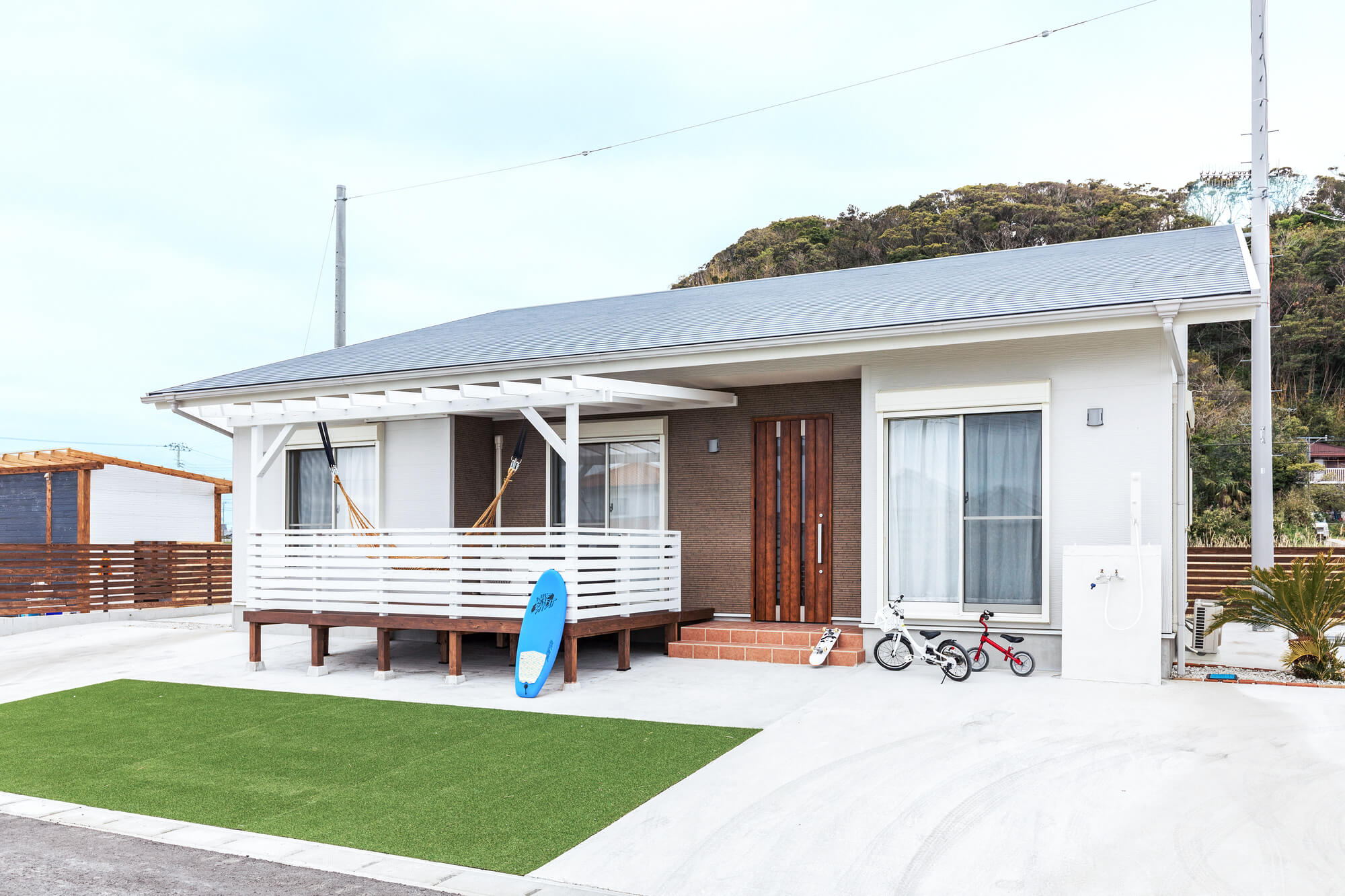 3LDKの広々とした空間に、3つのベッドルームをご用意しています。西海岸にいるようなオシャレなリビング。開放的な屋外のデッキで朝食をとっていただいたり、マクラメブランコに乗ってユラユラしたり。日常の喧騒から離れ、穏やかな時間をお楽しみください。